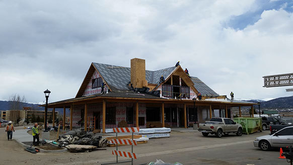New commercial development in Summit County's Frisco area. 110,000 sq ft building with Asphalt Shingle Steep Slope roofing, custom sheet metal, and Low Slope TPO roofing.